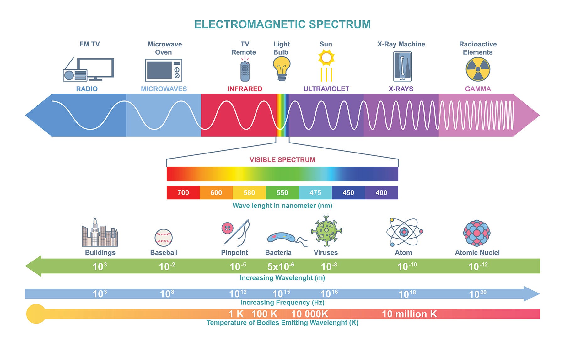 Wavelength: 380 nm to 100 nm (nanometers)