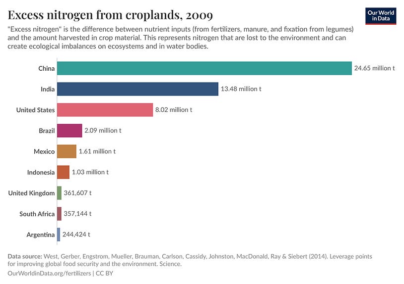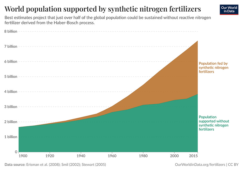 We need to rethink how we use nitrogen as a civilization. Using a finite supply of fossil fuels in an energy-intensive way to create synthetic fertilizers to put on agricultural fields that have been degraded—in part, by said fertilizers—to support ever-increasing populations (I hope it's obvious by now) is not sustainable.